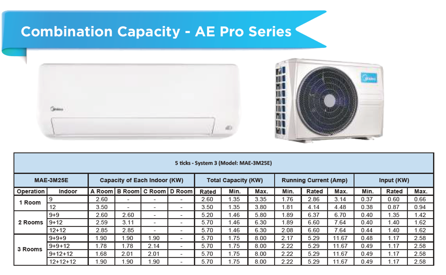 Midea MAE-3M25E allows connection of up to 2 indoor units with a Maximum Output for 27.3k BTU).